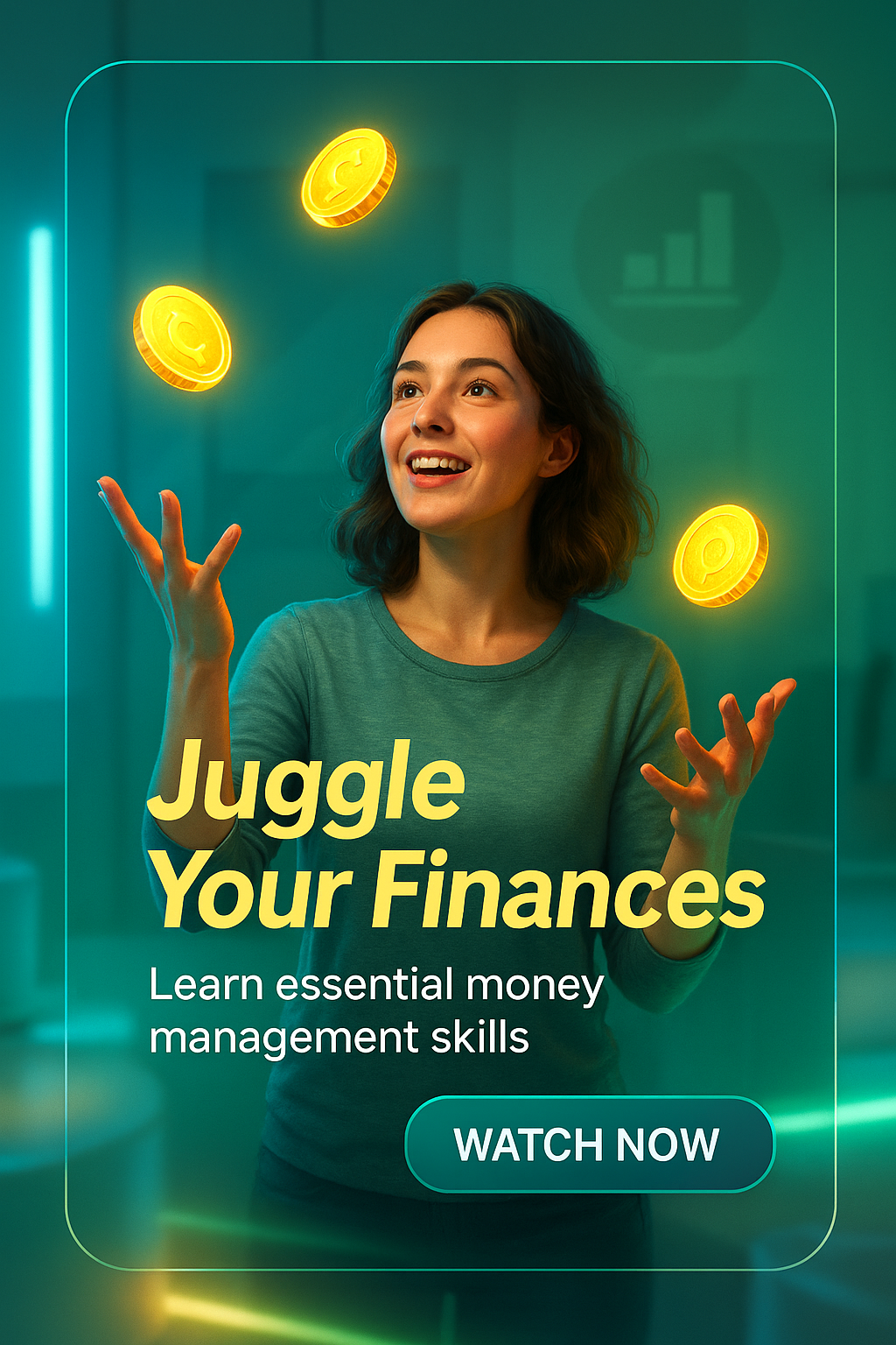 Engaging promotional image featuring a woman juggling coins, symbolizing financial management skills. Ideal for online course marketing aimed at young adults.