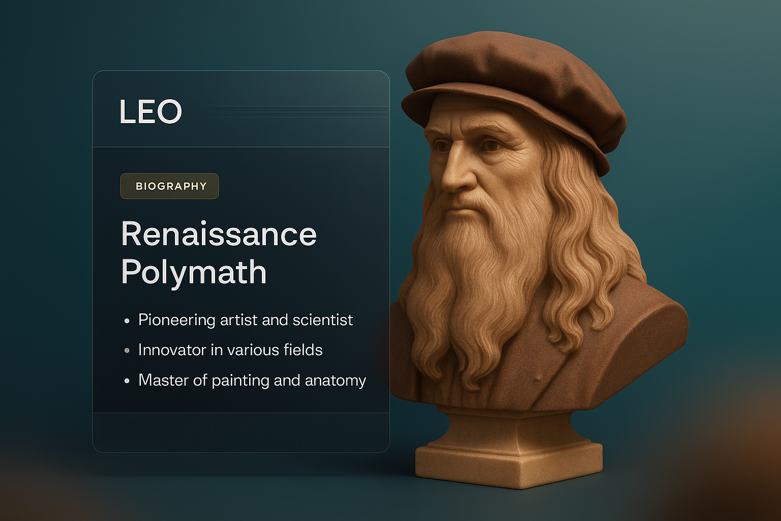 A visually striking 3D web page design featuring a detailed bust of a Renaissance polymath, with integrated text blocks and a gradient background, creating a seamless layout.