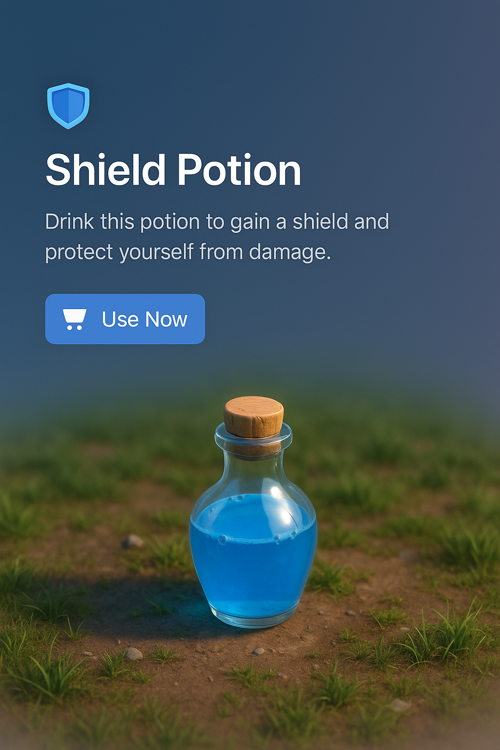 /Collection: /by davooda/Type: PNG/A zoomed-out 3D scene featuring a shield potion bottle surrounded by a grassy environment. The design includes a gradient background and an action button, creating a cohesive and appealing visual.