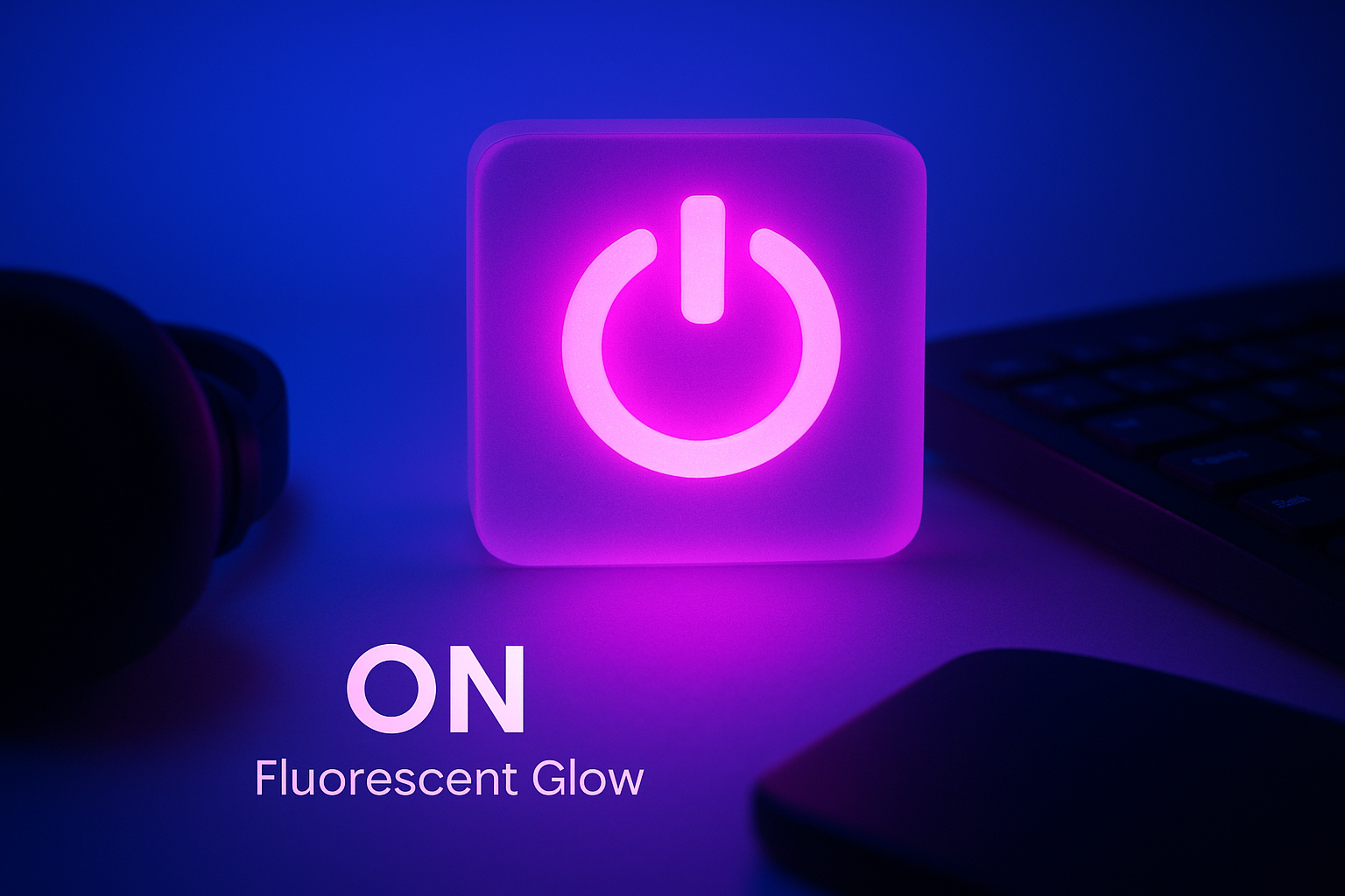 This image features a glowing power symbol in neon pink against a soft blue background, complemented by a headset and keyboard, creating a futuristic ambiance.