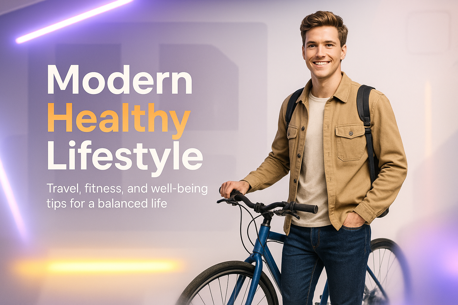 Modern Lifestyle Promotional Graphic Featuring Travel and Fitness Themes