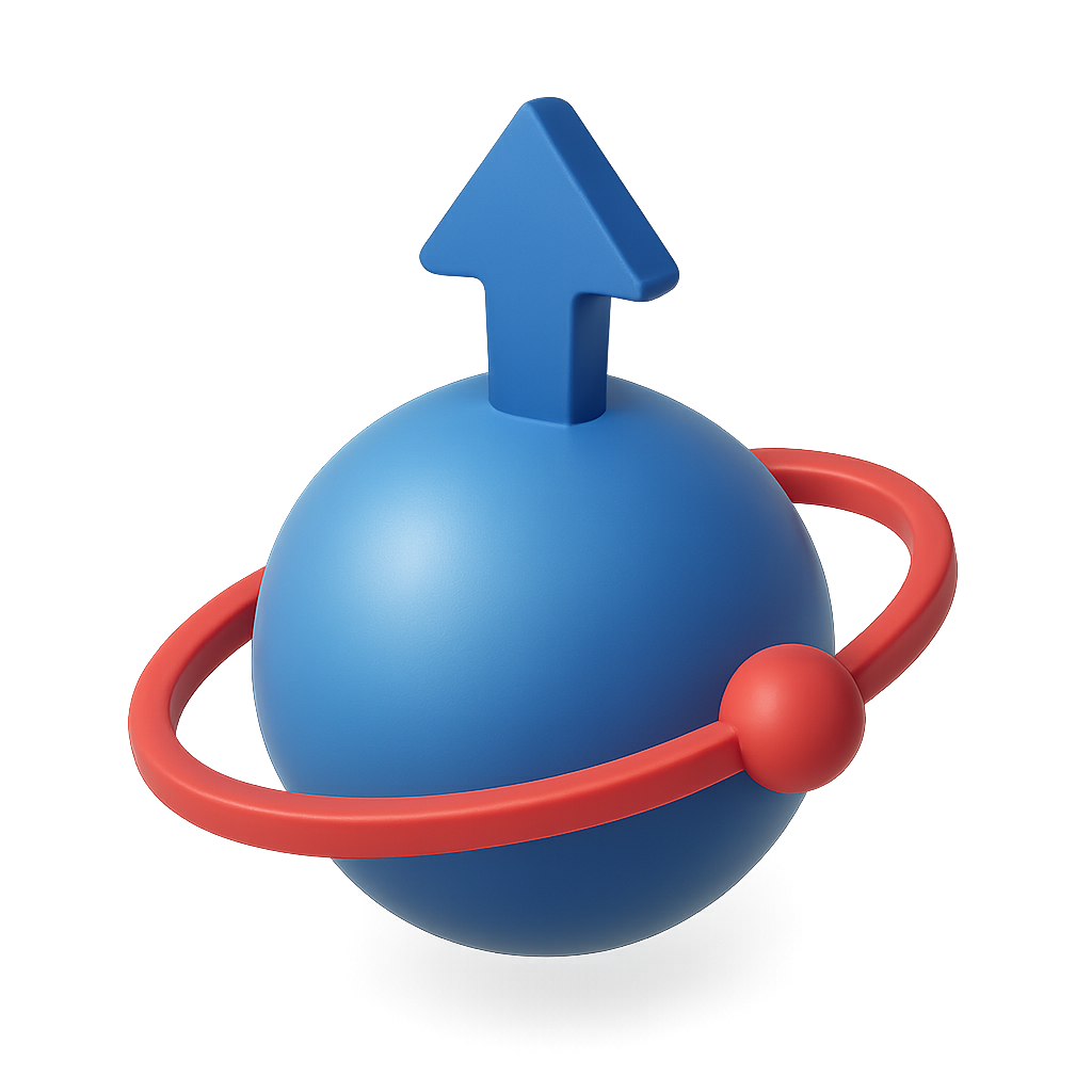 A stylized 3D icon depicting an electron spin, featuring a blue sphere with a red orbit and an upward arrow. The design is isometric and volumetric, set against a gradient background.