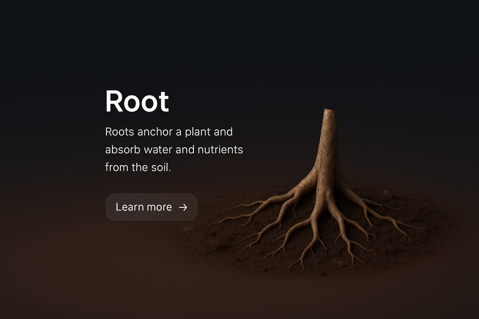 /Collection: /by davooda/Type: PNG/A detailed 3D scene showcasing a root system in a dark gradient background. The root is depicted realistically, with a small text block and action button adjacent, highlighting its role in nutrient absorption.