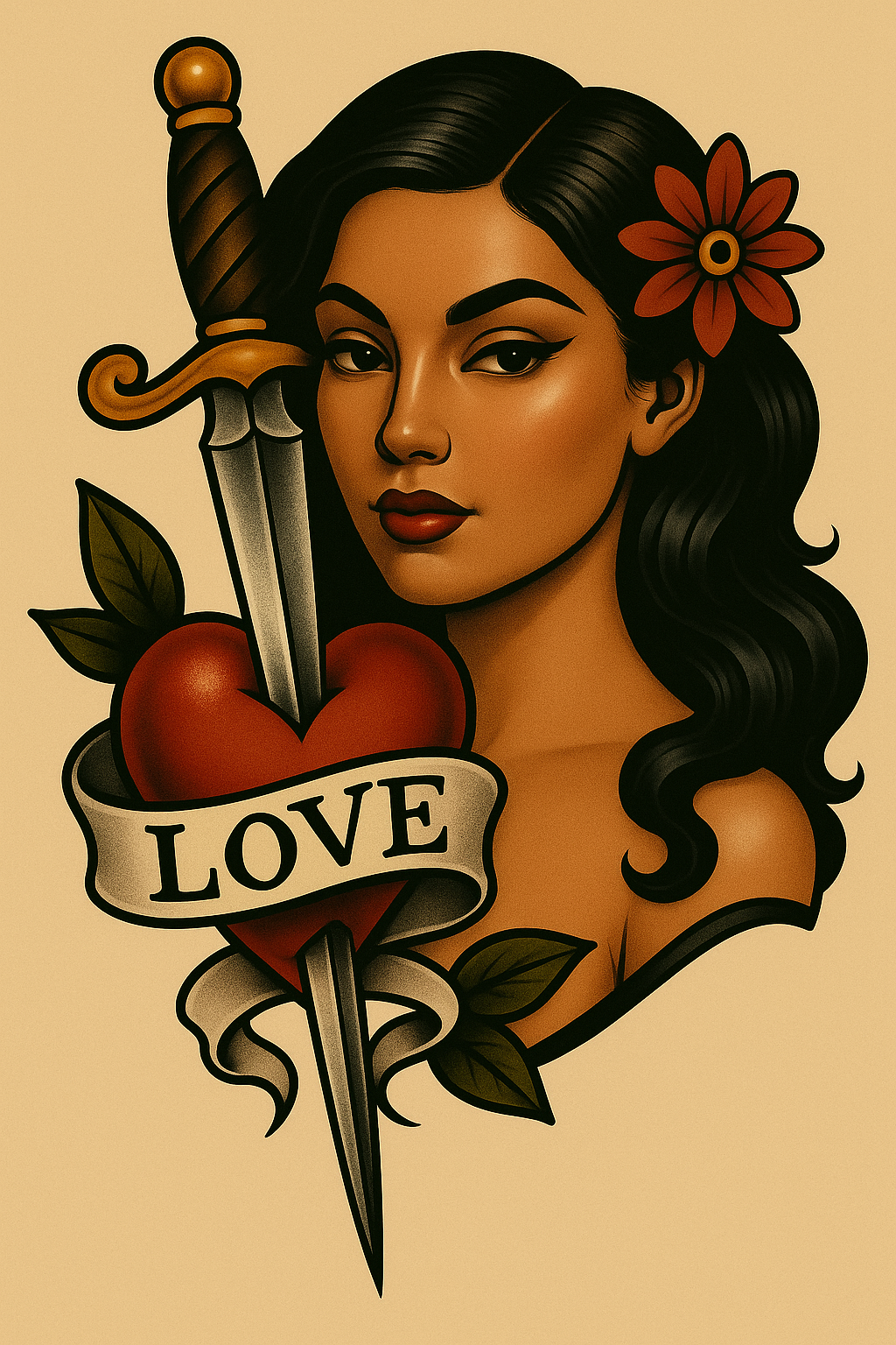 /Collection: /by davooda/Type: PNG/A striking glossy tattoo design featuring a woman with long hair, adorned with a flower. A dagger pierces a heart below her, accompanied by a 'LOVE' banner. The background is a soft beige.