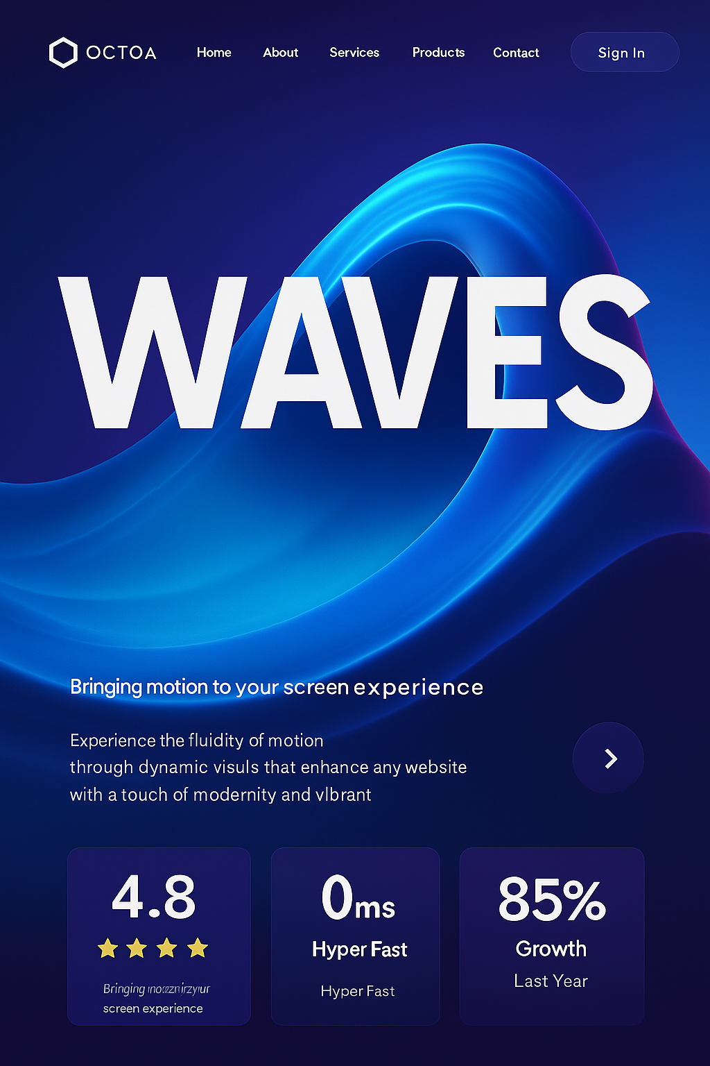 /Collection: , /by davooda/Type: PNG/A visually striking landing page design featuring a bold headline 'WAVES' set against an abstract blue wave background. The design showcases glowing accents and strong textures in a minimalistic style.