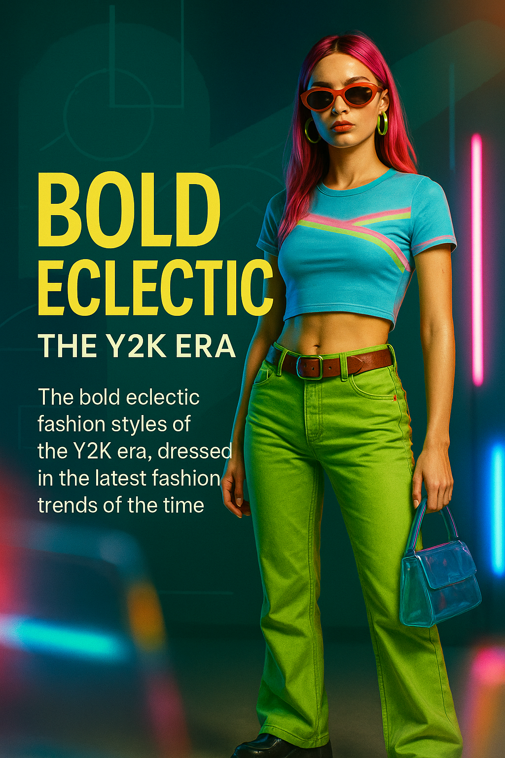 A striking fashion poster showcasing bold Y2K styles, featuring vibrant colors and a modern design. Ideal for fashion marketing and trends promotion.