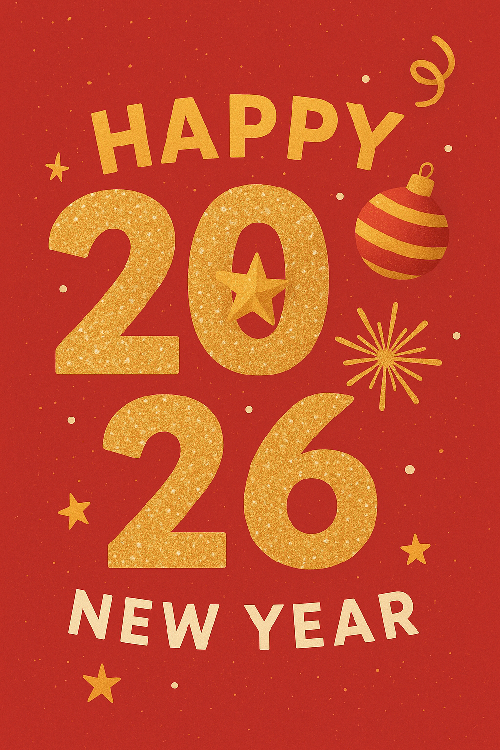 Vibrant New Year greeting card featuring bold typography with festive elements, perfect for seasonal celebrations and holiday wishes.