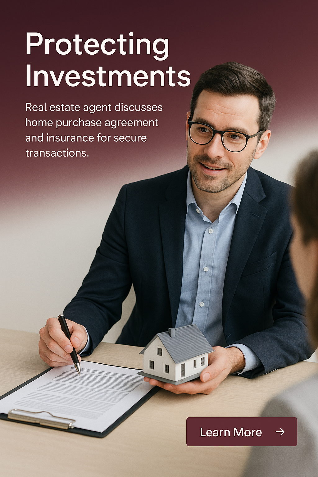 /Collection: /by davooda/Type: PNG/A professional real estate agent explains a home purchase agreement while holding a model house. The setting is formal, enhancing the theme of secure transactions.