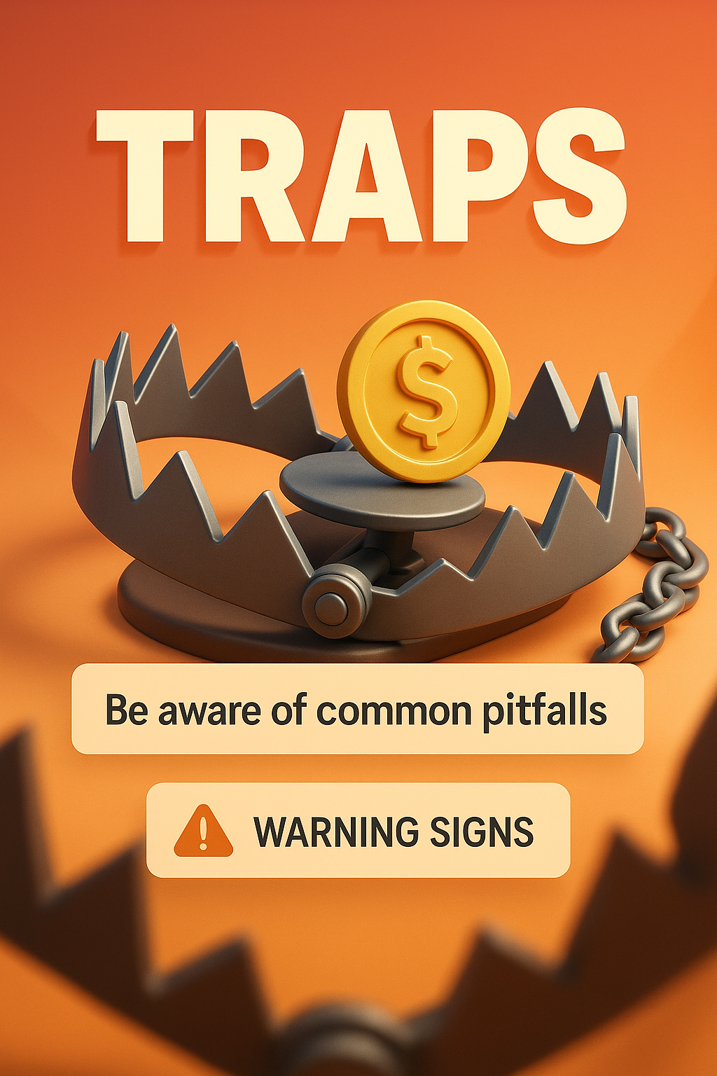 /Collection: /by davooda/Type: PNG/This graphic illustrates a financial trap concept, featuring a bear trap with a dollar coin, designed to warn viewers about common pitfalls. It is suitable for educational purposes.