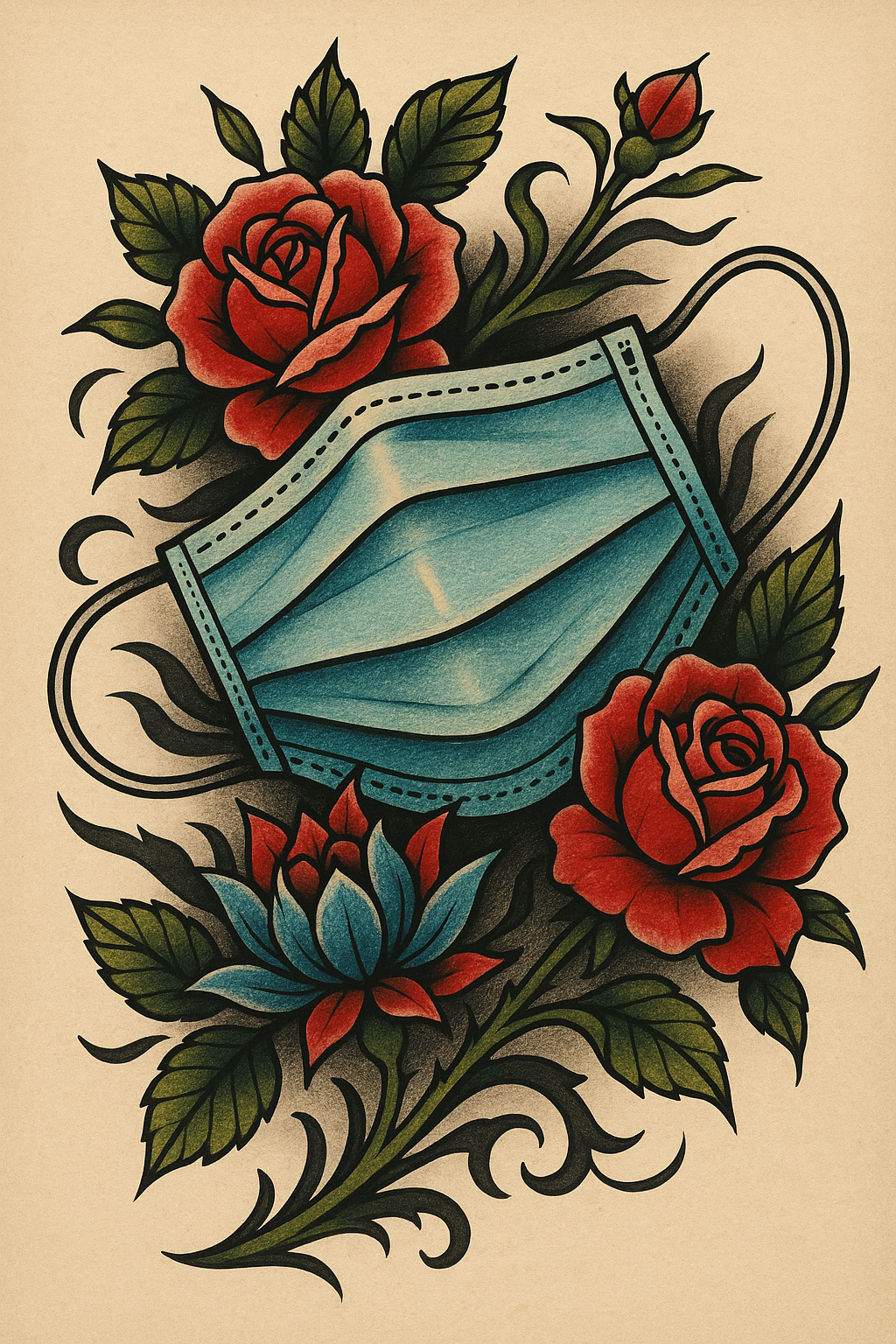 This image is a tattoo design featuring a surgical mask surrounded by roses and floral elements. The style is vibrant and illustrative, appealing to art enthusiasts and tattoo lovers.