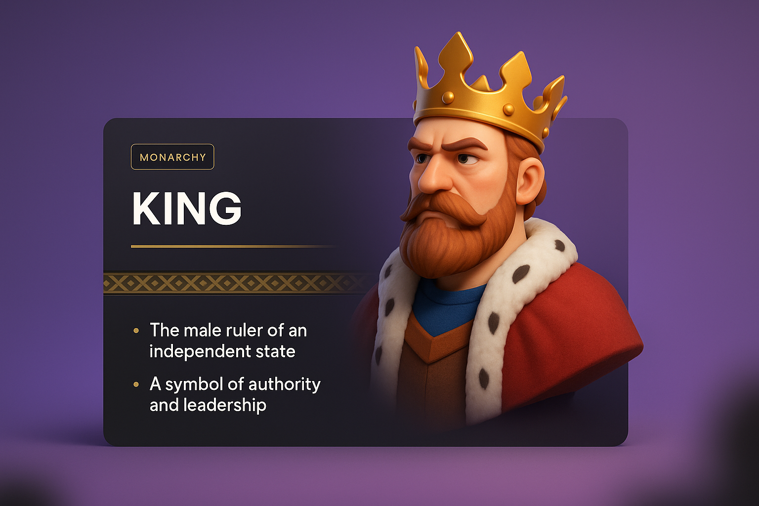 A detailed 3D illustration of a king character, showcasing elements of monarchy. Ideal for educational content, games, or storytelling.