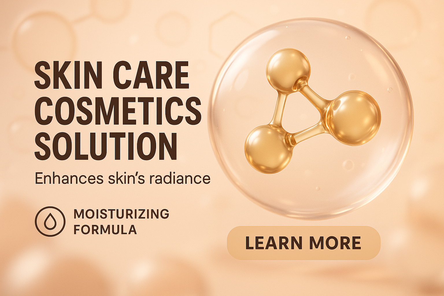 Modern promotional graphic for a skincare solution featuring a molecular structure, designed to enhance skin radiance. Ideal for cosmetic marketing.