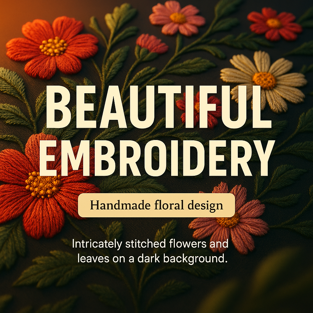 A beautifully crafted image featuring intricately stitched flowers and leaves against a dark background. Ideal for showcasing handmade craftsmanship in art or design contexts.