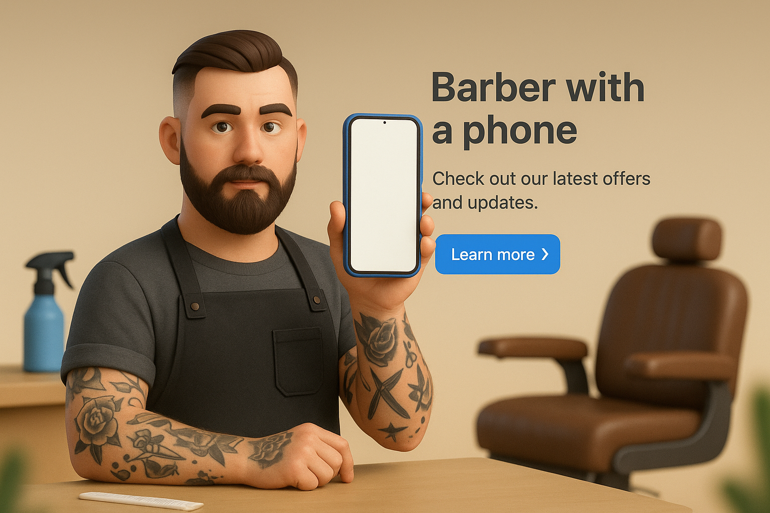 A 3D illustration of a tattooed barber holding a blue phone vertically. The scene captures a well-designed salon environment, featuring a gradient background and subtle foreground elements.