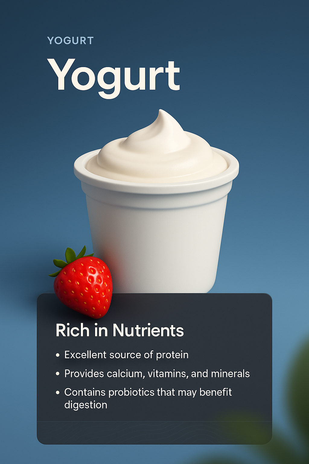 A 3D illustration of yogurt in a cup, accompanied by a fresh strawberry. The design features a dark label with nutrient information, set against a smooth gradient background.