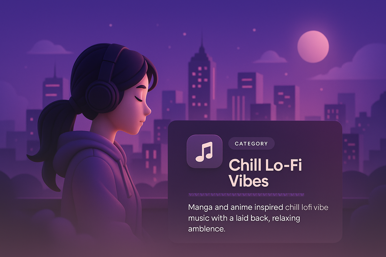/Collection: /by davooda/Type: PNG/A serene night skyline featuring a relaxed character with headphones, set against a gradient purple background. The design incorporates anime elements for a calming ambiance.