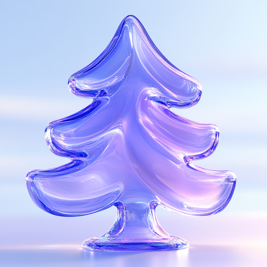 A beautifully crafted translucent glass sculpture of a Christmas tree, featuring smooth curves and a gradient of purple hues. Ideal for holiday decor or artistic display.