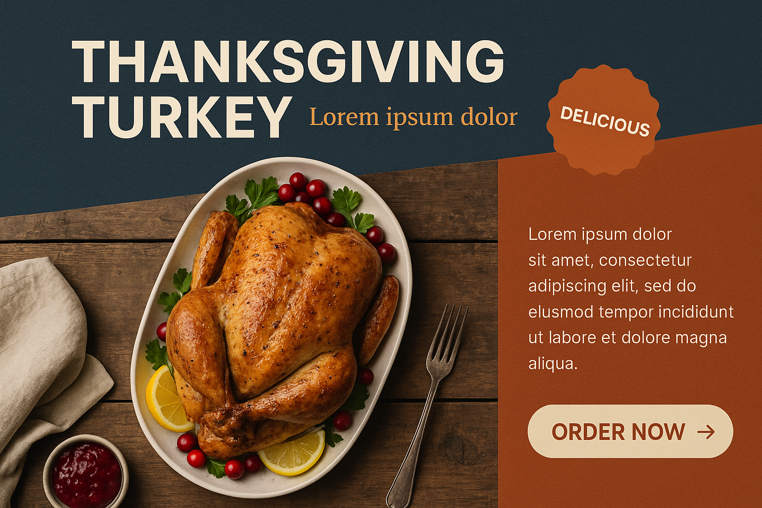 /Collection: /by davooda/Type: PNG/A beautifully roasted turkey is presented on a rustic wooden table, accompanied by vibrant cranberries. The design features a contrasting color scheme with clear text hierarchy and engaging elements.