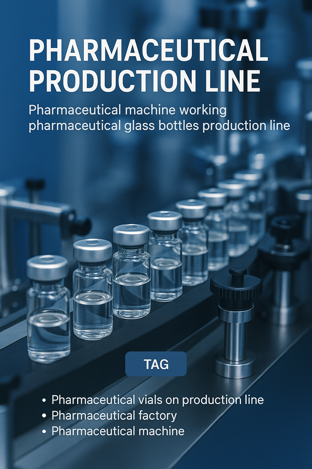 Detailed image showcasing a pharmaceutical production line featuring glass bottles, ideal for industry-related presentations and marketing materials.