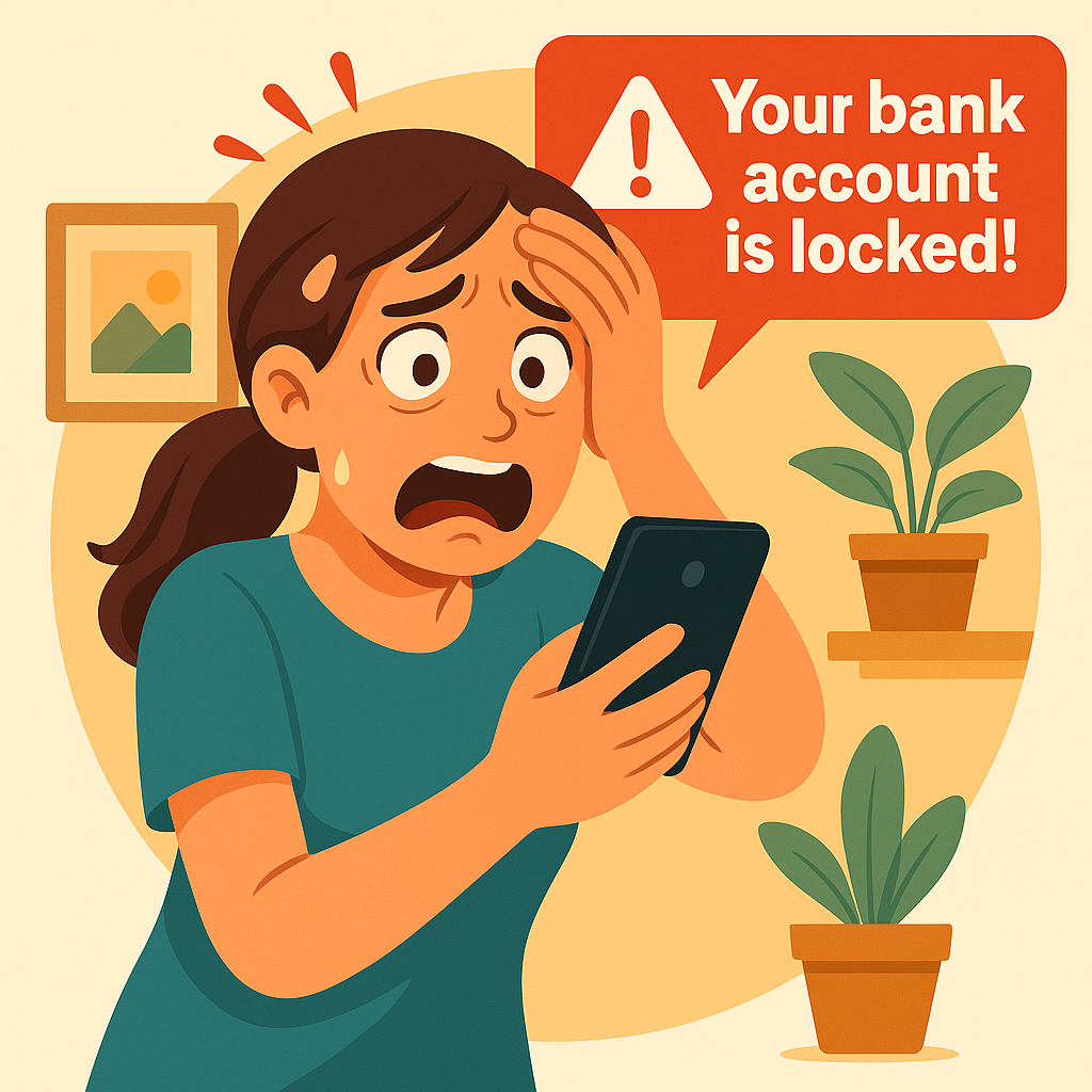 /Collection: /by davooda/Type: PNG/A digital illustration depicting a woman in distress upon receiving a notification about her bank account being locked. The design uses warm colors and a cartoonish style, making it relatable for financial awareness campaigns.