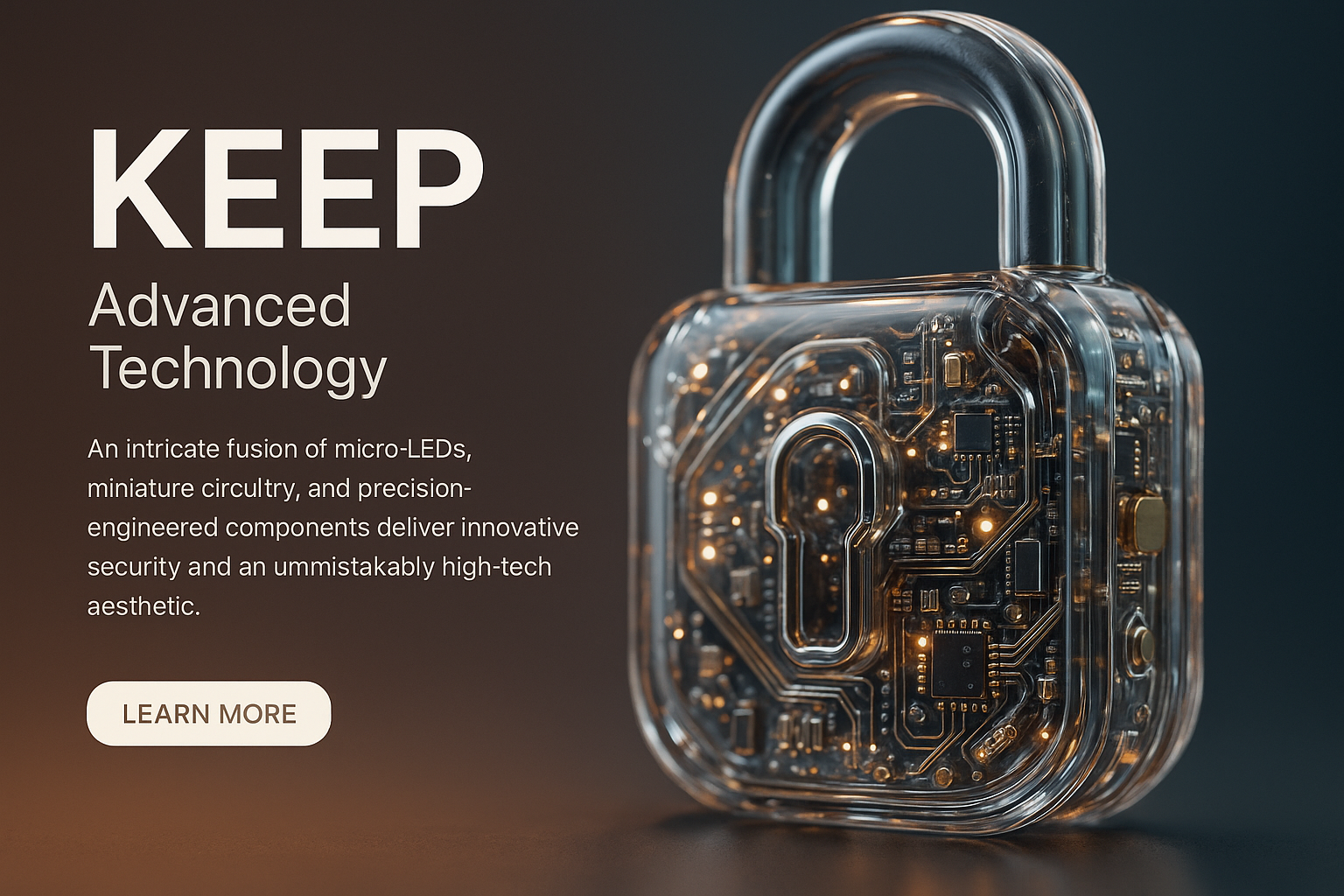 /Collection: /by davooda/Type: PNG/This hyperrealistic image showcases a futuristic lock made of clear, glass-like polymers. It reveals intricate micro-LEDs and circuit boards, reflecting stylish lighting and a high-tech aesthetic.