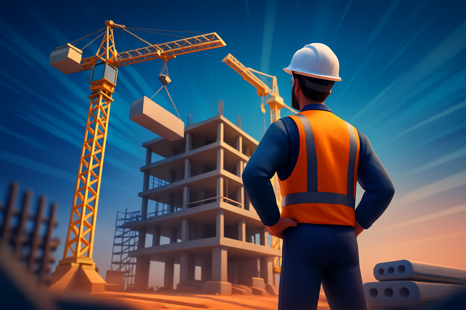 /Collection: /by davooda/Type: PNG/A civil engineer in a hard hat and safety vest stands confidently at a dynamic construction site, surveying cranes and a multi-story building under construction. The scene captures a blend of professionalism and energy.