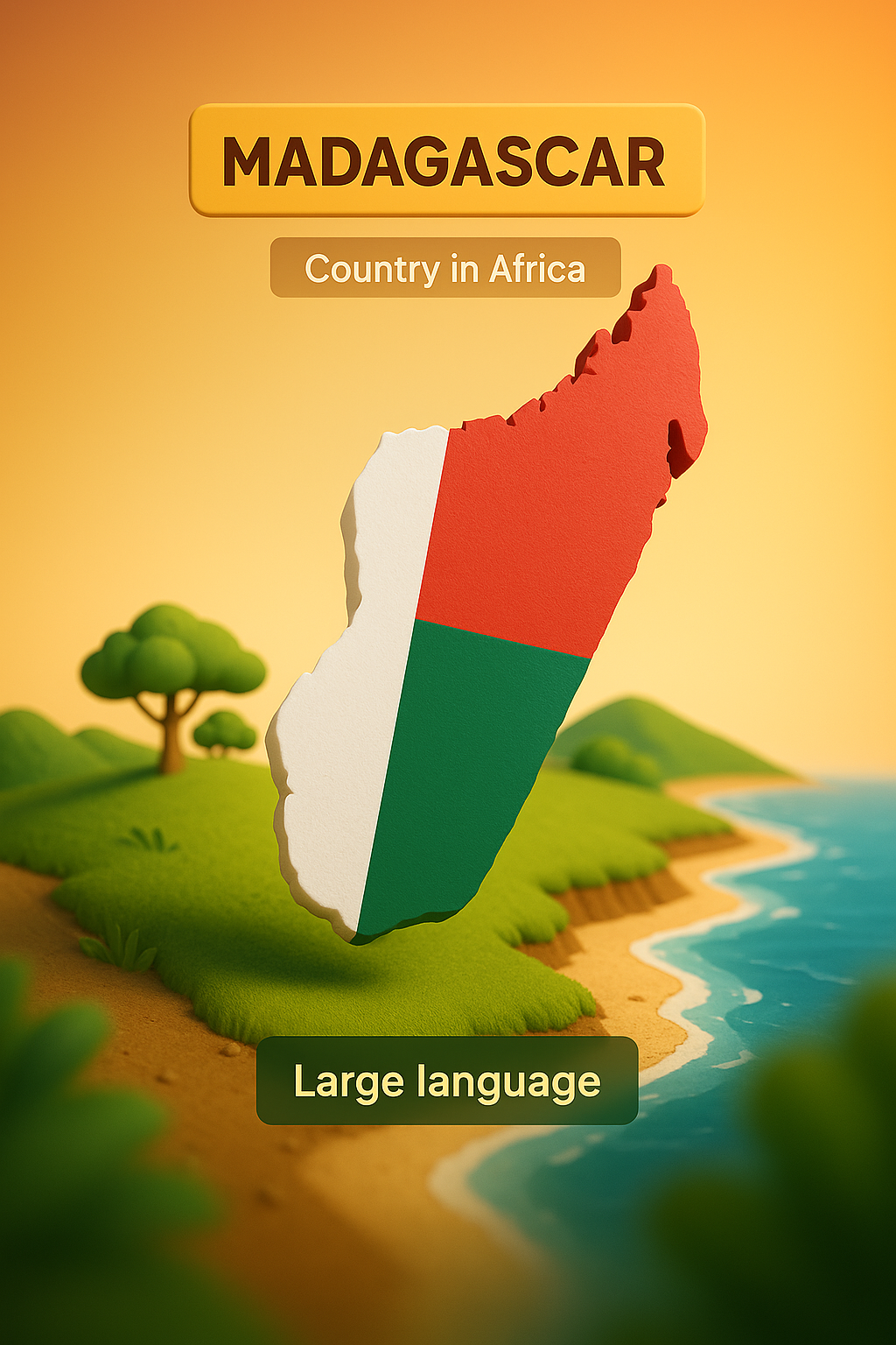 A vibrant 3D illustration of Madagascar's map set against a tropical landscape, ideal for educational content or travel-related materials.