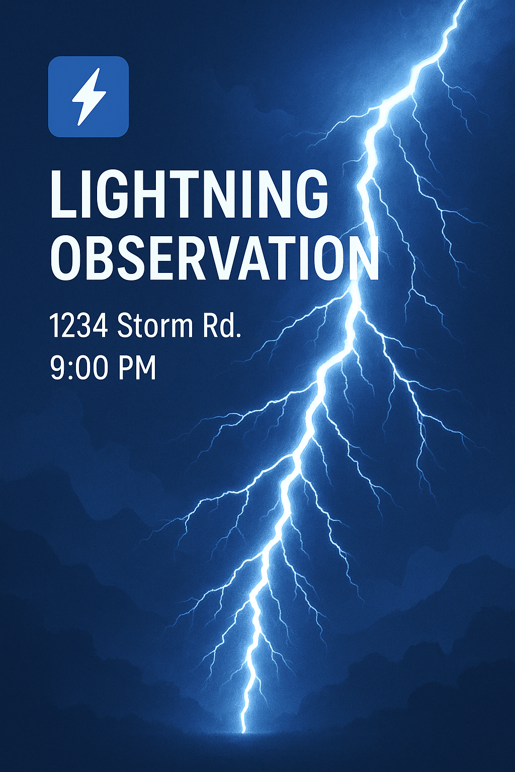 Dynamic event announcement graphic showcasing a lightning bolt against a dark stormy background, ideal for weather-related events or educational sessions.