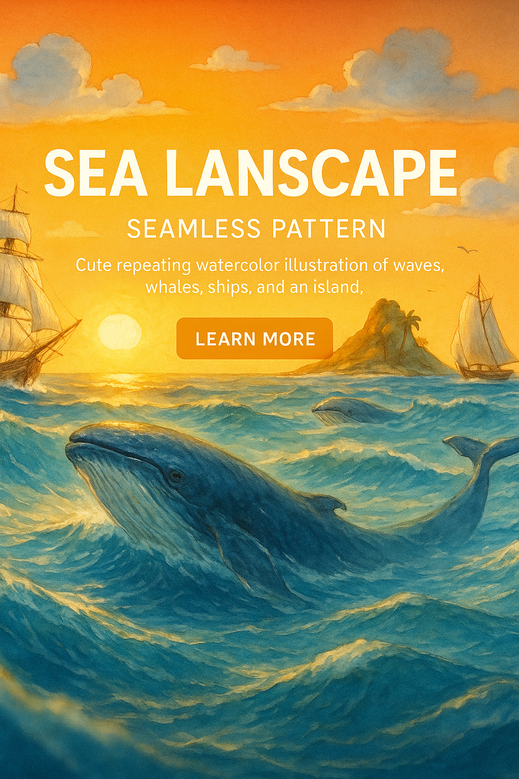 This image features a seamless pattern of watercolor illustrations depicting waves, whales, ships, and an island, ideal for artistic designs.