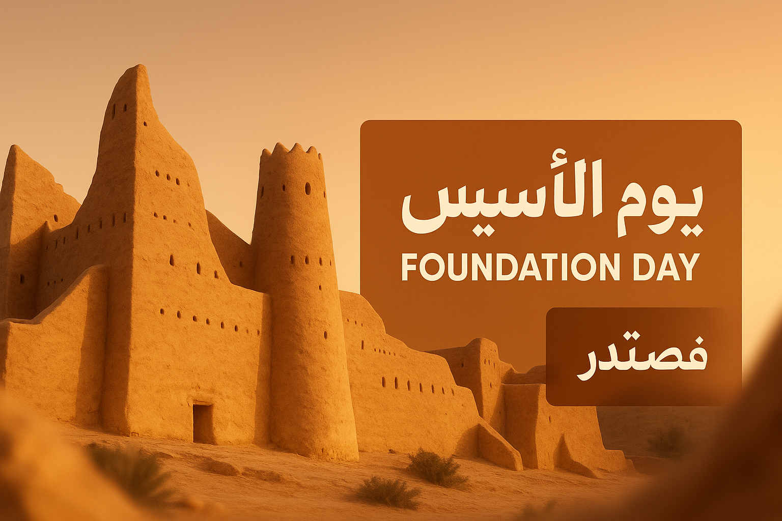 Visually striking graphic depicting an ancient fortress in a desert landscape, celebrating Foundation Day with bilingual text. Ideal for cultural promotion and social media sharing.