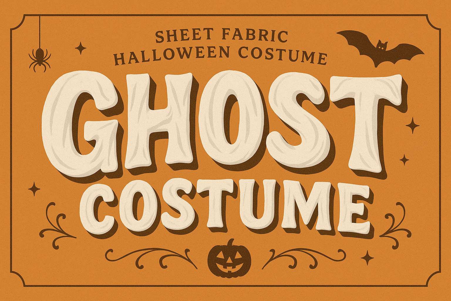 Playful Halloween costume promotional graphic showcasing a ghost costume theme with bold typography and festive colors, ideal for seasonal marketing.