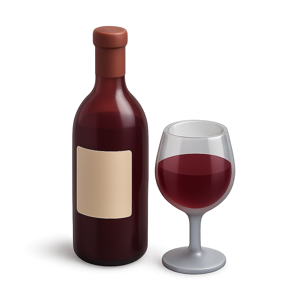 A visually appealing 3D representation of a wine bottle and glass. The image showcases a dark red wine bottle next to a filled wine glass, both featuring a glossy finish and isometric perspective.