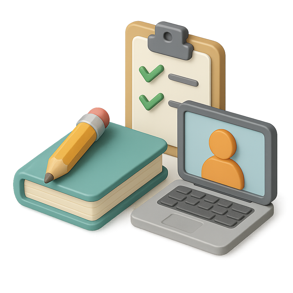 /Collection: /by davooda/Type: PNG/A colorful 3D icon featuring a pencil, a checklist, a book, and a laptop, designed for interview preparation. The elements are arranged in a three-quarter isometric view with a transparent background.