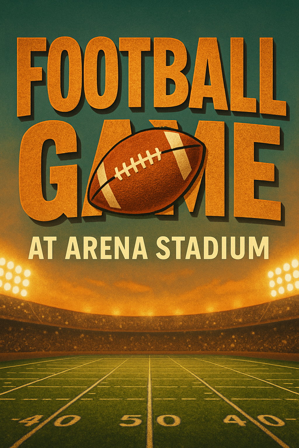 Vibrant promotional graphic featuring a football and stadium background, designed to attract attendees to a football game at Arena Stadium. Ideal for event marketing.