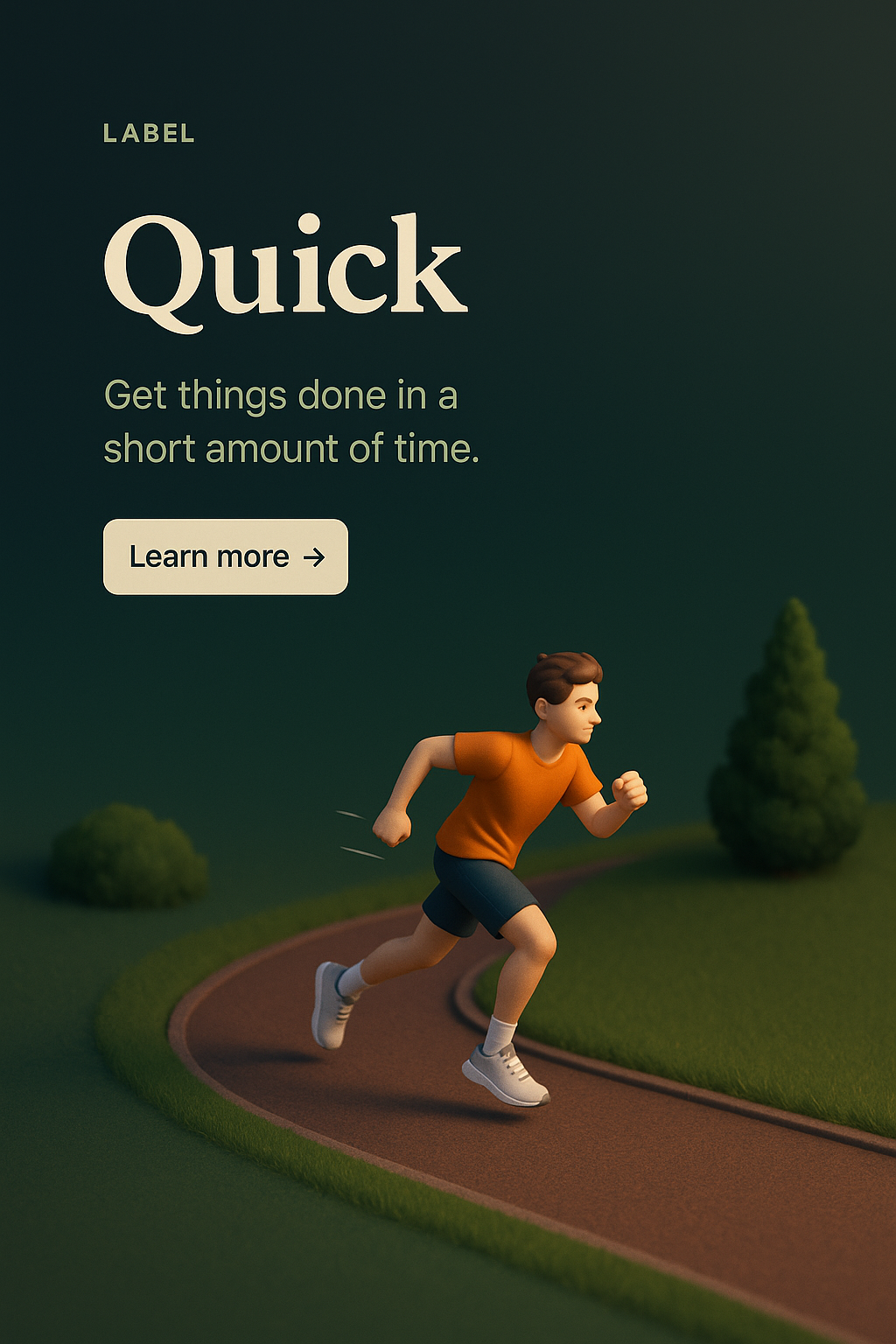 /Collection: /by davooda/Type: PNG/A vibrant 3D illustration of a runner in motion on a path, set against a dark gradient background. The scene features lush green trees and a well-defined foreground, emphasizing speed and urgency.