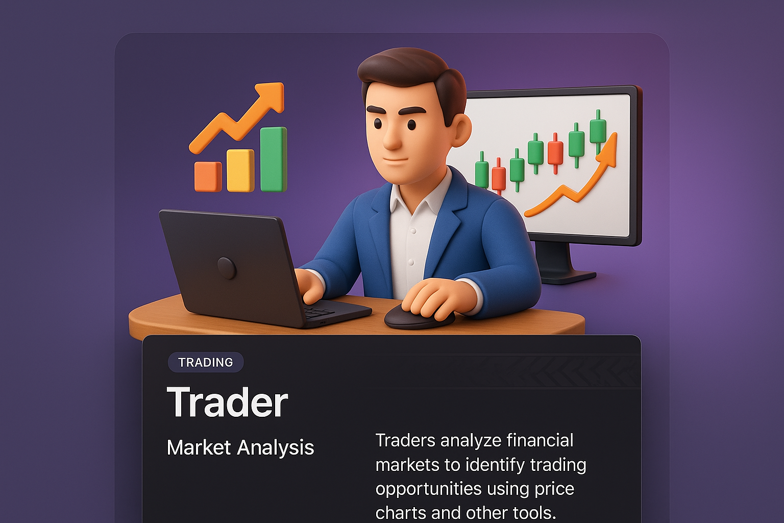 /Collection: /by davooda/Type: PNG/A vibrant 3D illustration featuring a trader at a desk, analyzing market trends on a laptop. Graphs and charts visually represent trading data, enhancing the financial theme.