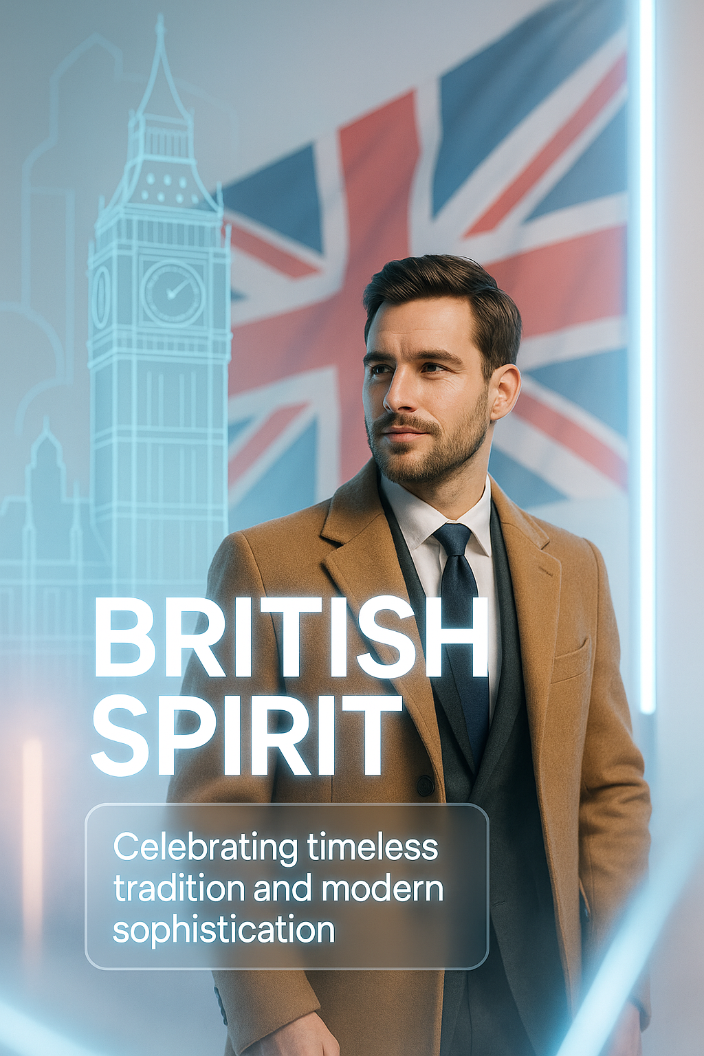/Collection: /by davooda/Type: PNG/A modern promotional image showcasing British culture with a stylish male model in formal attire against a backdrop of the Union Jack and iconic London elements, ideal for fashion or cultural campaigns.