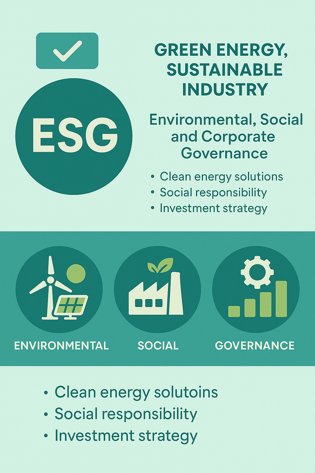 Engaging infographic detailing Environmental, Social, and Governance (ESG) principles with a clean design suitable for educational purposes and corporate presentations.