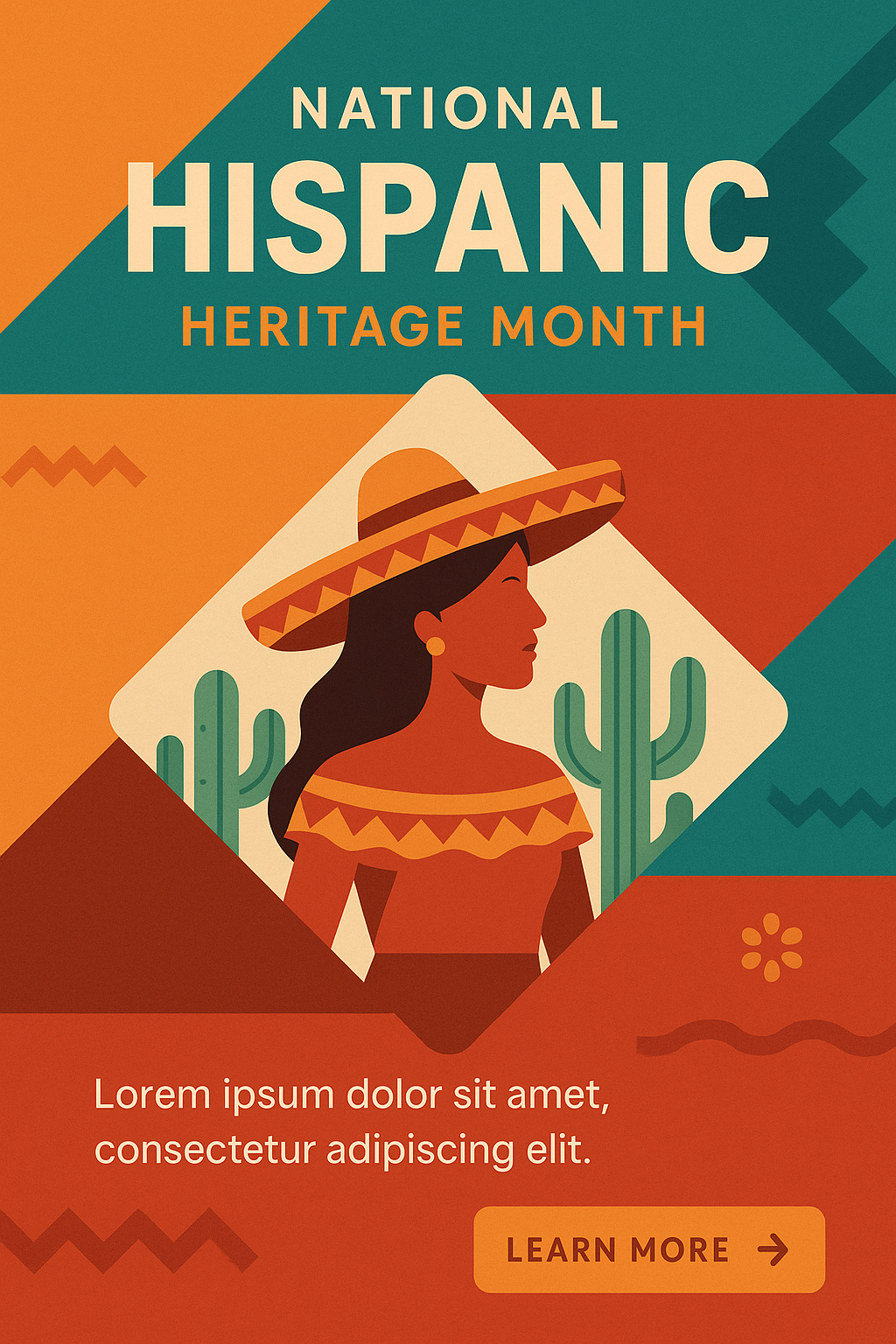 /Collection: /by davooda/Type: PNG/A visually striking design for National Hispanic Heritage Month featuring geometric shapes, vibrant colors, and cultural elements like cacti and a woman in traditional attire.