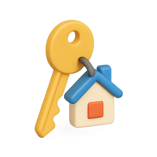 /Collection: /by davooda/Type: PNG/A vibrant 3D illustration featuring a key attached to a house-shaped keychain, representing themes of homeownership and real estate. Ideal for marketing and promotional materials.