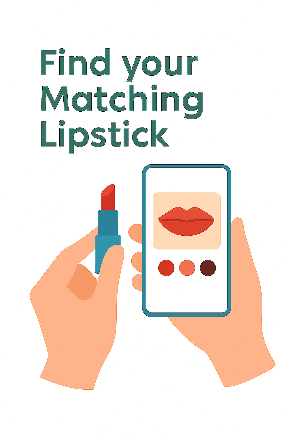 A colorful illustration depicting hands holding a lipstick and a smartphone displaying lip shades, aimed at beauty enthusiasts. Ideal for digital marketing in cosmetics.