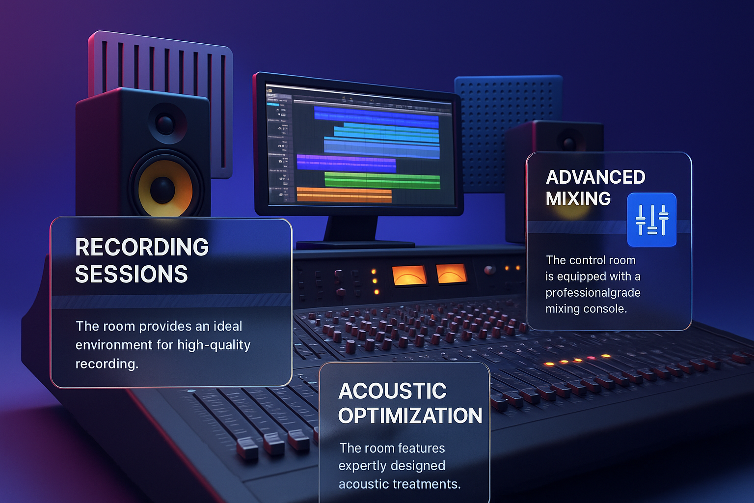 /Collection: /by davooda/Type: PNG/A visually engaging 3D illustration of a recording studio control room featuring advanced audio equipment, vibrant colors, and highlighted features like acoustic optimization and mixing.