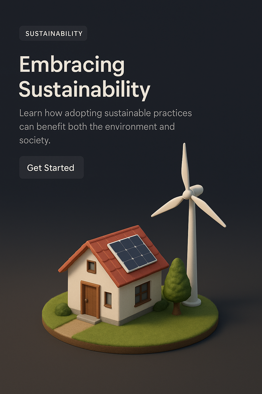 /Collection: /by davooda/Type: PNG/A visually appealing 3D scene featuring a small house with solar panels and a wind turbine, set against a dark gradient background. The design emphasizes sustainability.