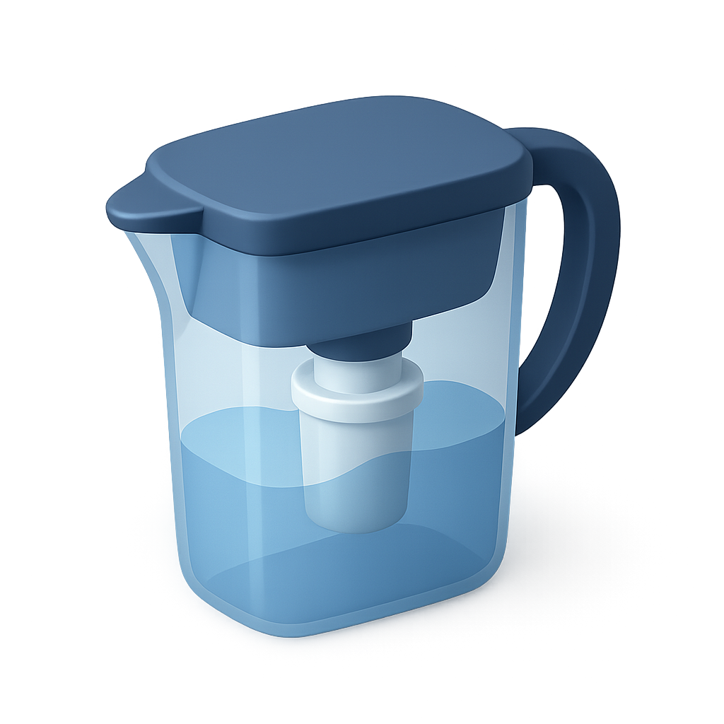 /Collection: /by davooda/Type: PNG/A sleek 3D icon of a water filter pitcher viewed from a three-quarter angle, featuring a transparent background and a volumetric design that highlights its modern aesthetic.