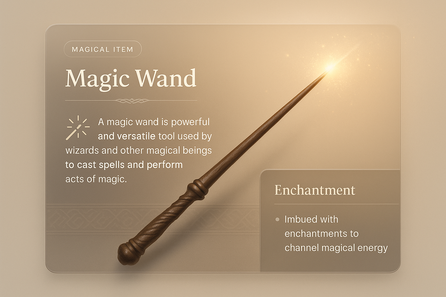 /Collection: /by davooda/Type: PNG/A beautifully crafted illustration of a magic wand, featuring a glowing tip. An informative overlay provides details about its enchanting properties, designed with a soft gradient background.