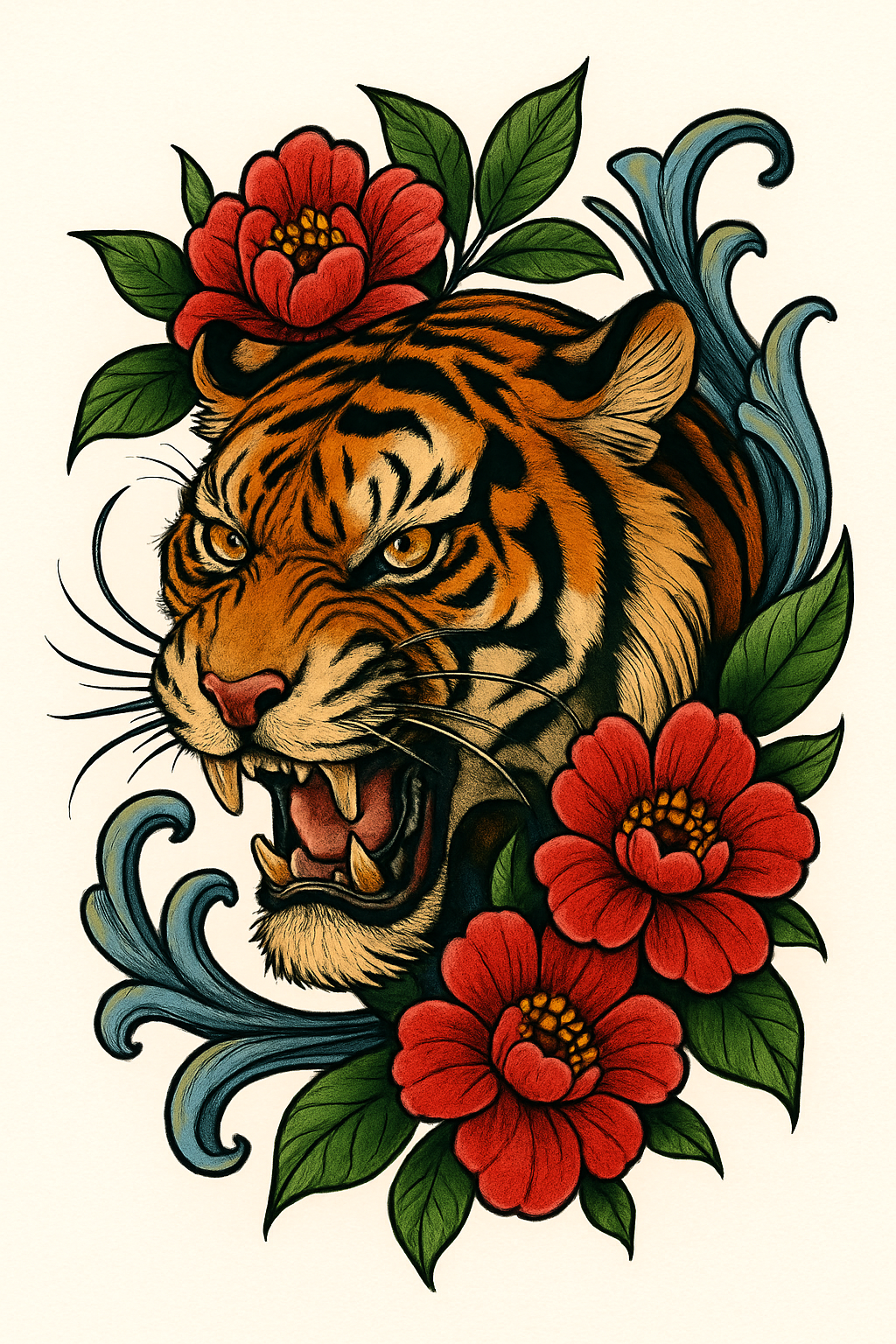 A striking illustration of a fierce tiger’s head surrounded by vibrant flowers and foliage. This artwork showcases bold colors and intricate details, perfect for tattoo designs or decorative prints.