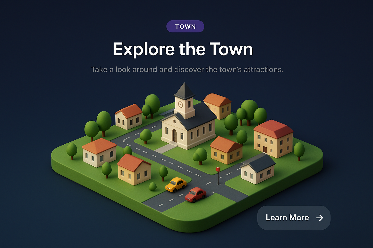 A detailed 3D aerial view of a small town featuring houses, a clock tower, and cars. The scene is colorful with a dark gradient background, emphasizing the town's inviting atmosphere.