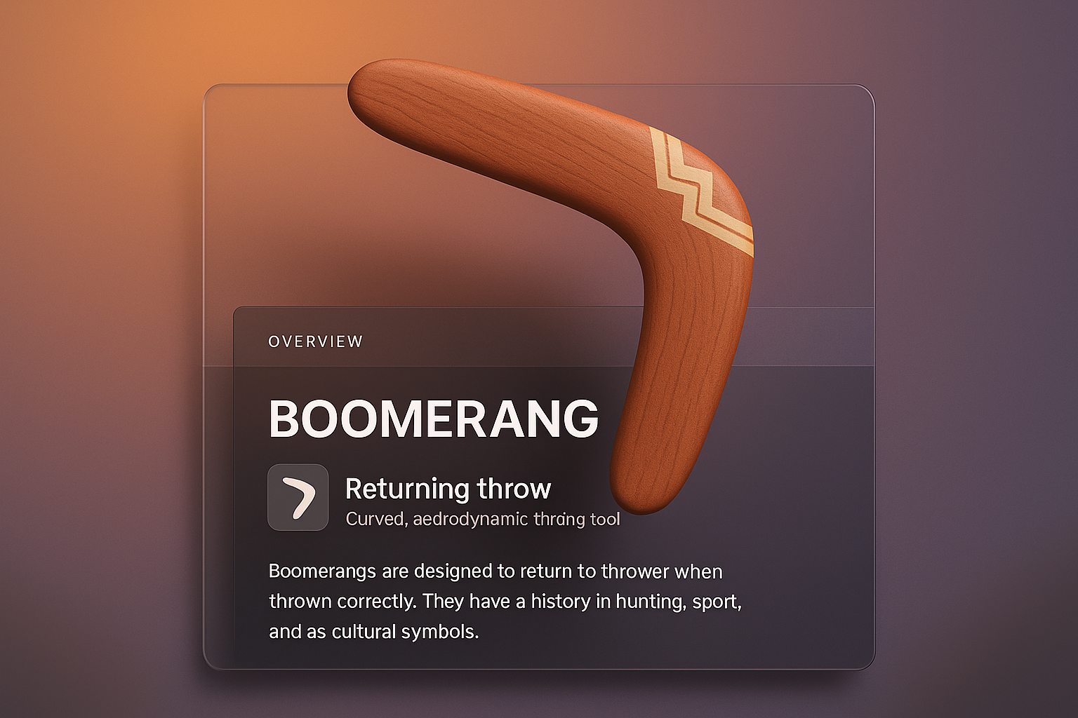 /Collection: /by davooda/Type: PNG/A 3D illustration of a boomerang with a sleek design, featuring an informative overlay. The background transitions from a gradient to a solid color, enhancing the visual appeal.