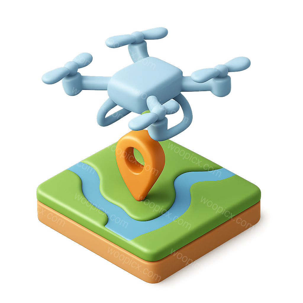 A colorful 3D isometric icon featuring a drone hovering above a stylized map with a river and a location pin, all presented on a transparent background.