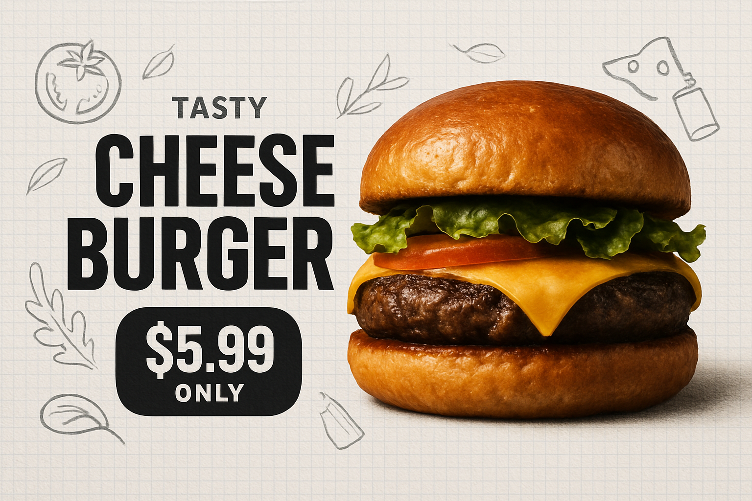 /Collection: /by davooda/Type: PNG/A vibrant advertisement featuring a delicious cheese burger on a textured grid paper background. Bold typography highlights the price and product, creating an appealing layout.